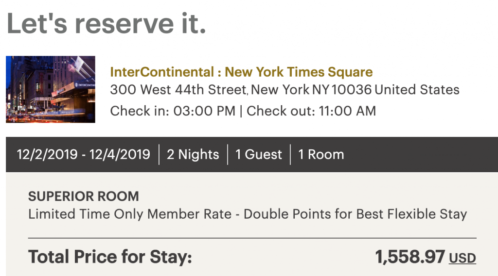 Here’s an example: We’ve decided to stay in New York for a couple of nights at the beginning of December. Is it cheaper to pay the regular rate or just buy the points and redeem them?* First, the cash rate: