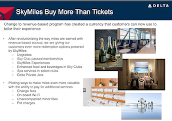But that’s what they have done. Miles are now high-margin products to sell whose value the airlines control, since they’re the ones who determine how many miles a ticket costs. And now, the airlines have sold so many miles that they’ve come up with all kinds of other opportunities to use them. Check out this page from the Delta Airlines 2016 Investor Day Presentation: