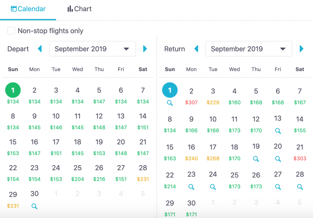 You can now see the entire month at a glance! No trying to guess which days of the week offer the best deals. Skyscanner does that for you. Pick the cheapest ones that fit your schedule and you’re off!