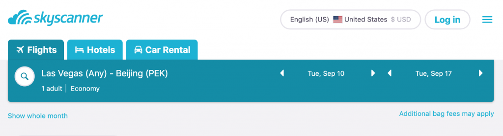 I use Skyscanner to find the cheapest city pairs. Here’s a quick hint on seeing everything at once. Go to the Skyscanner homepage and enter any city pair, along with any dates that you want. You’ll get a screen like this: