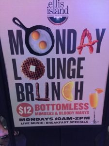 Ellis Island does a creative brunch on Mondays. The “Monday Lounge Brunch” runs from 10 a.m. to 2 p.m. and features bottomless bloody Marys and mimosas for $12. There’s also six entrée choices for $6.99 each.