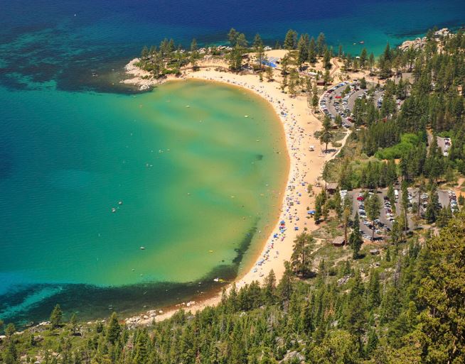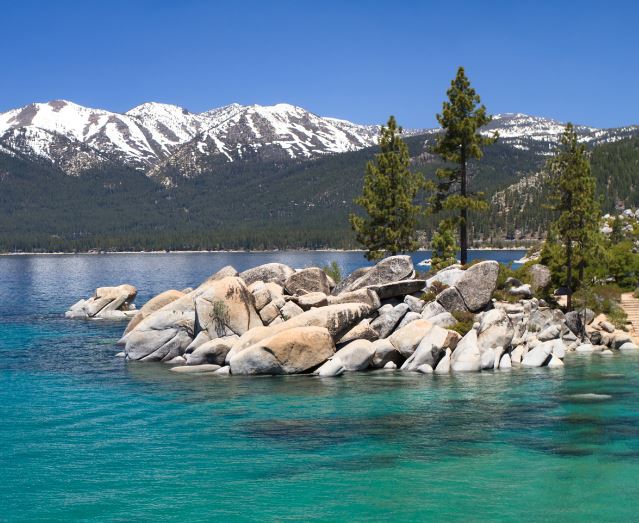 The east side, by contrast, is completely undeveloped from the south edge of Incline Village to the north end of Zephyr Cove. Lake Tahoe-Nevada State Park and U.S. Forest Service land stretch along the lakefront for nearly 20 miles and up into the mountains for four to five miles to the east—just steep slopes, tall trees, and hiking and mountain-biking trails. Sand Harbor (pictured directly below), part of the state park, is the biggest and most picturesque beach on the lake.