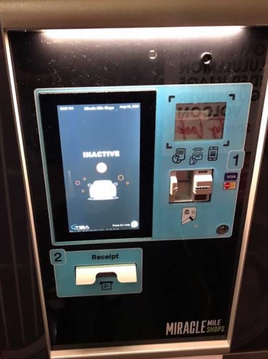 Both machines take credit cards and one also takes cash. There’s also an optical scanner for bar codes on one. An unmarked push button at the top is probably to call for assistance.